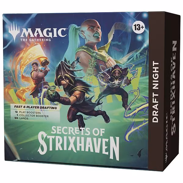 Samle vennegjengen til den ultimate magiker-duellen! Secrets of Strixhaven Draft Night er en alt-i-ett-pakke designet for 4 spillere. Pakken inneholder nok Play Boostere til en fullverdig draft, rikelig med land-kort til alle dekkene, og en eksklusiv Collector Booster som setter en ekstra spiss på kvelden – perfekt som premie til den som står igjen som vinner av Strixhaven-turneringen!