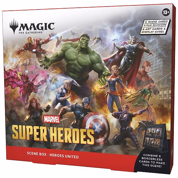 Scene Box: Heroes United er en helt spesiell utgivelse som kombinerer gleden ved å spille Magic med lidenskapen for Marvels fantastiske kunstverk. Denne boksen inneholder seks promokort som sammen danner et sammenhengende og storslått motiv ("scene"). Dette er det perfekte tilskuddet til hyllen for enhver samler som ønsker å stille ut Marvel-heltene sine på en unik måte.