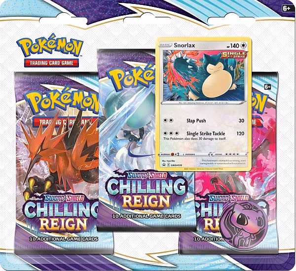 Gjør deg klar for en iskald utfordring i kronelandet! Denne 3-pack blisteren fra Chilling Reign gir deg tre sjanser til å finne de sagnomsuste Alternate Art-kortene av de legendariske fuglene i deres Galarian-former, eller den mektige Calyrex VMAX.