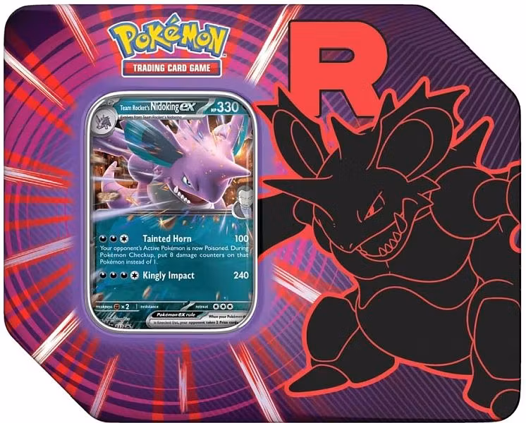 Spre frykt på spillbordet med den giftige kraften til Team Rocket’s Nidoking ex! Denne eksklusive tinnboksen lar deg alliere deg med en av Team Rockets mest brutale Pokémon. Som en del av den sjeldne amerikanske utgaven (USA Version), inneholder denne boksen hele 5 booster-pakker, noe som gir deg enda flere sjanser til å finne sjeldne kort fra de nyeste settene.
